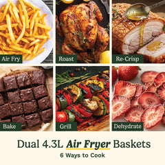 - DUAL AIR FRYER BASKETS WITH 6 COOKING FUNCTIONS - for Flexible, Faster Cooking – Air fry, roast, grill, bake, re-crisp, and dehydrate in two independent zones, letting you cook different foods at the same time with tailored settings