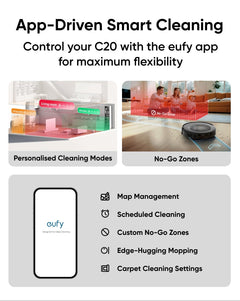 - 𝟕,𝟎𝟎𝟎 𝐏𝐚 𝐏𝐨𝐰𝐞𝐫𝐟𝐮𝐥 𝐒𝐮𝐜𝐭𝐢𝐨𝐧: Equipped with a robust 7,000 Pa suction, a rolling brush, and a side brush, C20 efficiently tackles dirt crumbs, pet hair, and debris. Note: Performance may vary depending on floor type and dust levels.